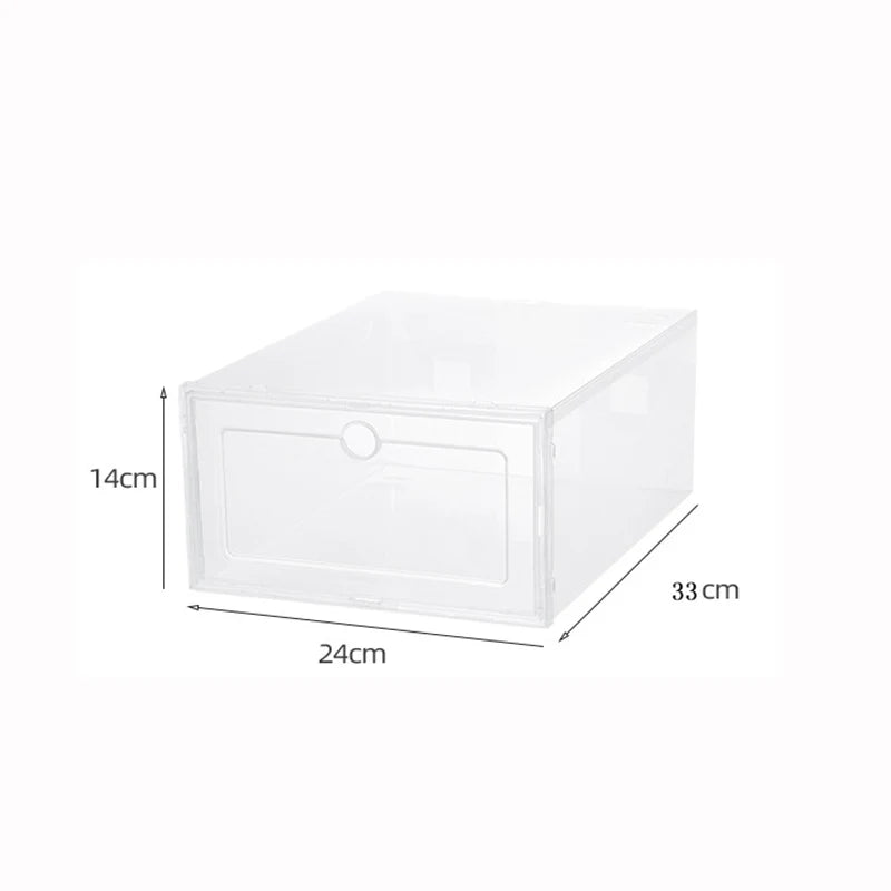 1. Transparent shoe storage box, free stacking, stable and strong weighing capacity.